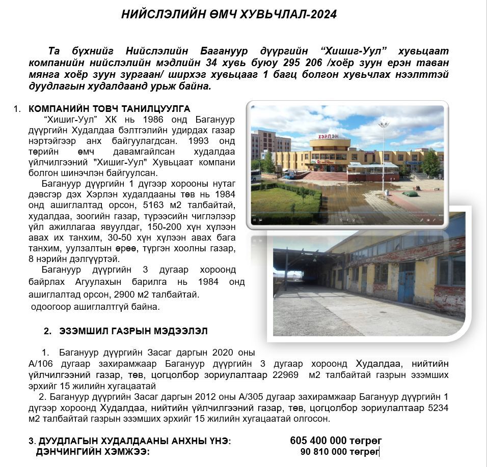 Багануур дүүргийн "Хишиг-Уул" хувьцаат компанийн хувьцааг хувьчлах нээлттэй дуудлагын худалдаанд урьж байна.