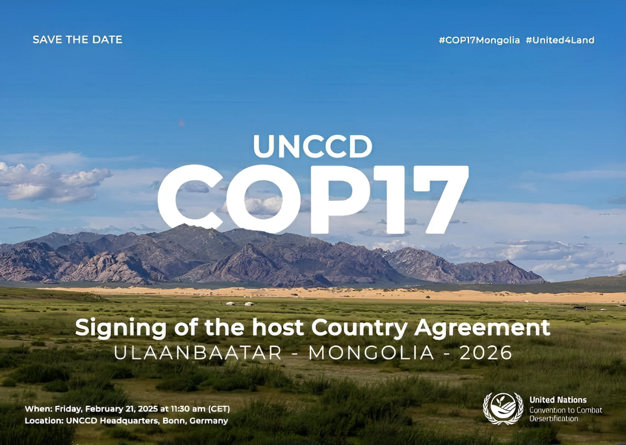 НҮБ-ын Цөлжилттэй тэмцэх конвенцын талуудын 17 дугаар бага хурлыг Монгол Улсад 2026 оны наймдугаар сарын 17-28-нд зохион байгуулна. Дэлхийн 190 гаруй орны 10 мянга орчим төлөөлөгч оролцох тус хурлын үеэр цөлжилт, газрын доройтол, ган гачиг, бэлчээр зэрэг хүн төрөлхтний өмнө тулгамдаж буй байгаль орчны асуудал, сорилт, тэдгээрийг шийдэх арга замыг хэлэлцэх юм.