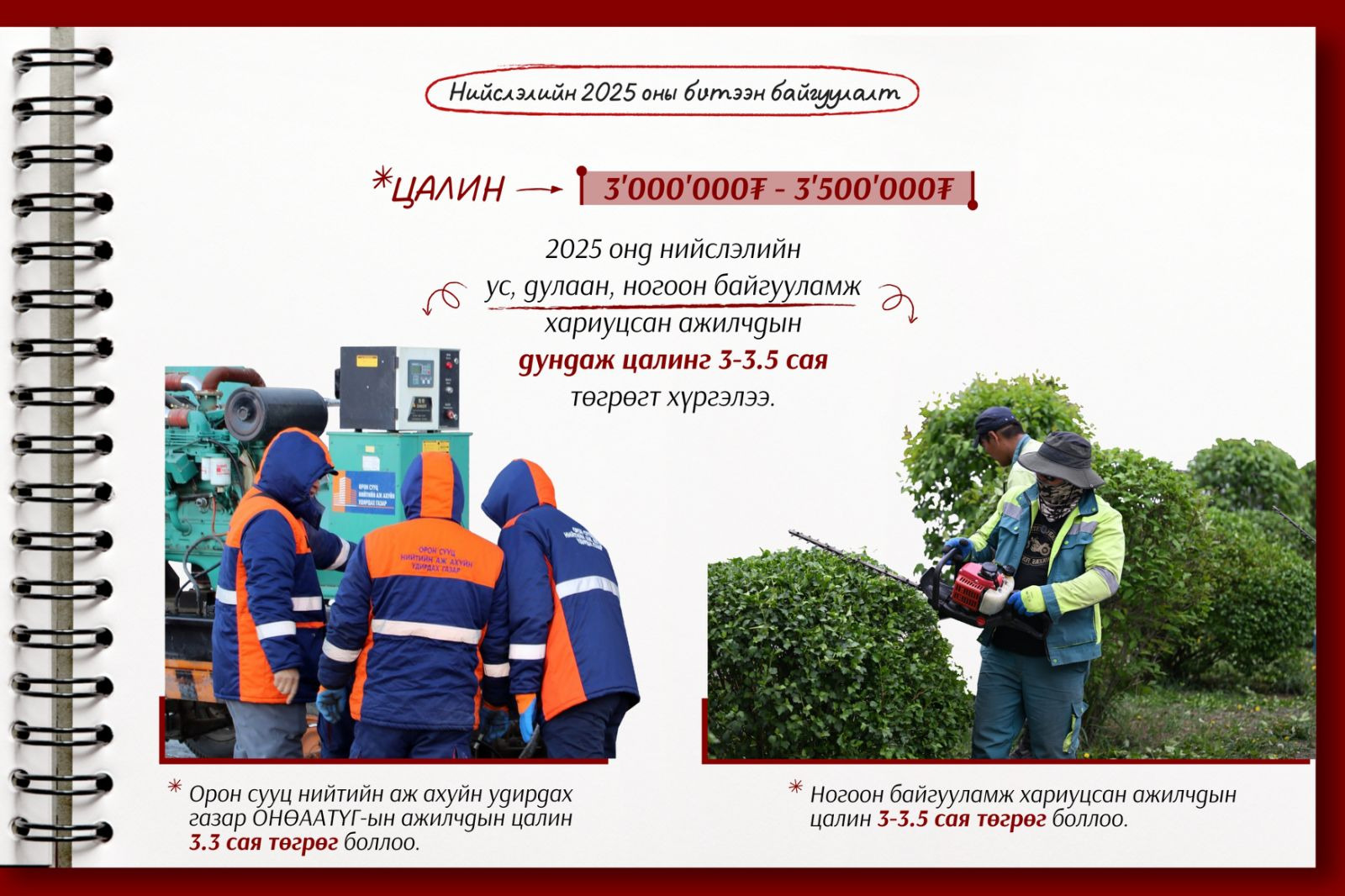 2025 онд нийслэлийн ус, дулаан, ногоон байгууламж хариуцсан ажилчдын дундаж цалинг 3-3.5 сая төгрөгт хүргэлээ.