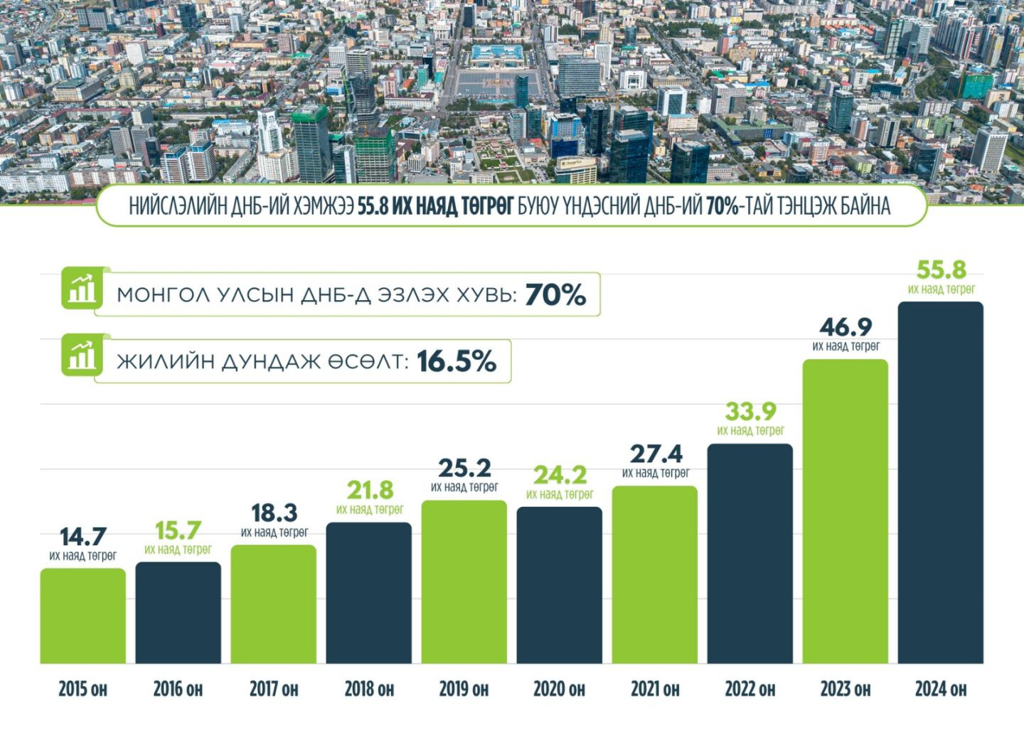 Нийслэлийн ДНБ-ий хэмжээ 55.8 их наяд төгрөгт хүрч, Монгол Улсын ДНБ-ий 70 хувийг бүрдүүлж байна: