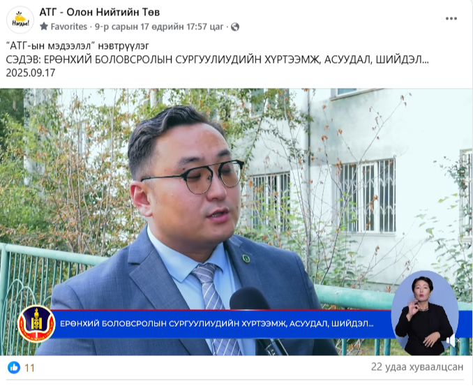 “АТГ-ын мэдээлэл” нэвтрүүлэг СЭДЭВ: ЕРӨНХИЙ БОЛОВСРОЛЫН СУРГУУЛИУДИЙН ХҮРТЭЭМЖ, АСУУДАЛ, ШИЙДЭЛ...