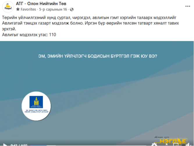 Иргэн бүр өөрийн төлсөн татварт хяналт тавих эрхтэй. Авлигыг мэдээлэх утас: 110