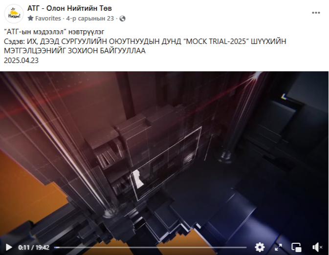 “АТГ-ын мэдээлэл” нэвтрүүлэг Сэдэв: ИХ, ДЭЭД СУРГУУЛИЙН ОЮУТНУУДЫН ДУНД “МOCK TRIAL-2025” ШҮҮХИЙН МЭТГЭЛЦЭЭНИЙГ ЗОХИОН БАЙГУУЛЛАА
