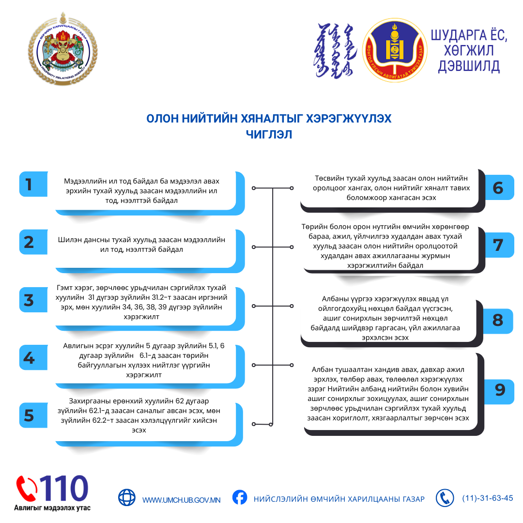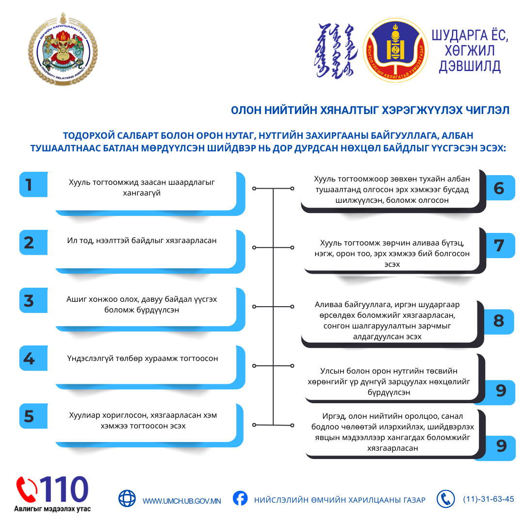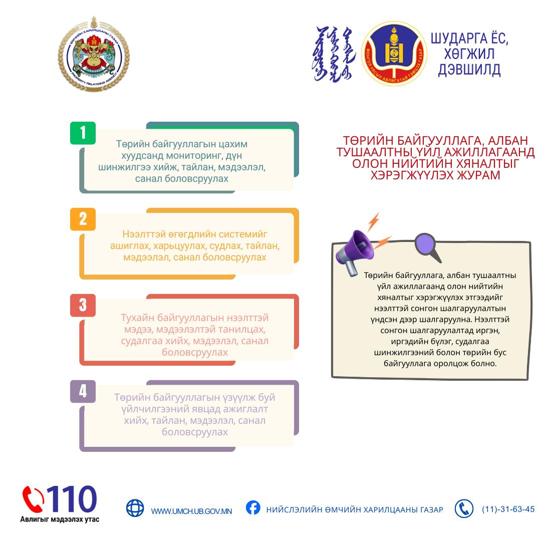 ТӨРИЙН БАЙГУУЛЛАГА, АЛБАН ТУШААЛТНЫ ҮЙЛ АЖИЛЛАГААНД ОЛОН НИЙТИЙН ХЯНАЛТЫГ ХЭРЭГЖҮҮЛЭХ ЖУРАМ